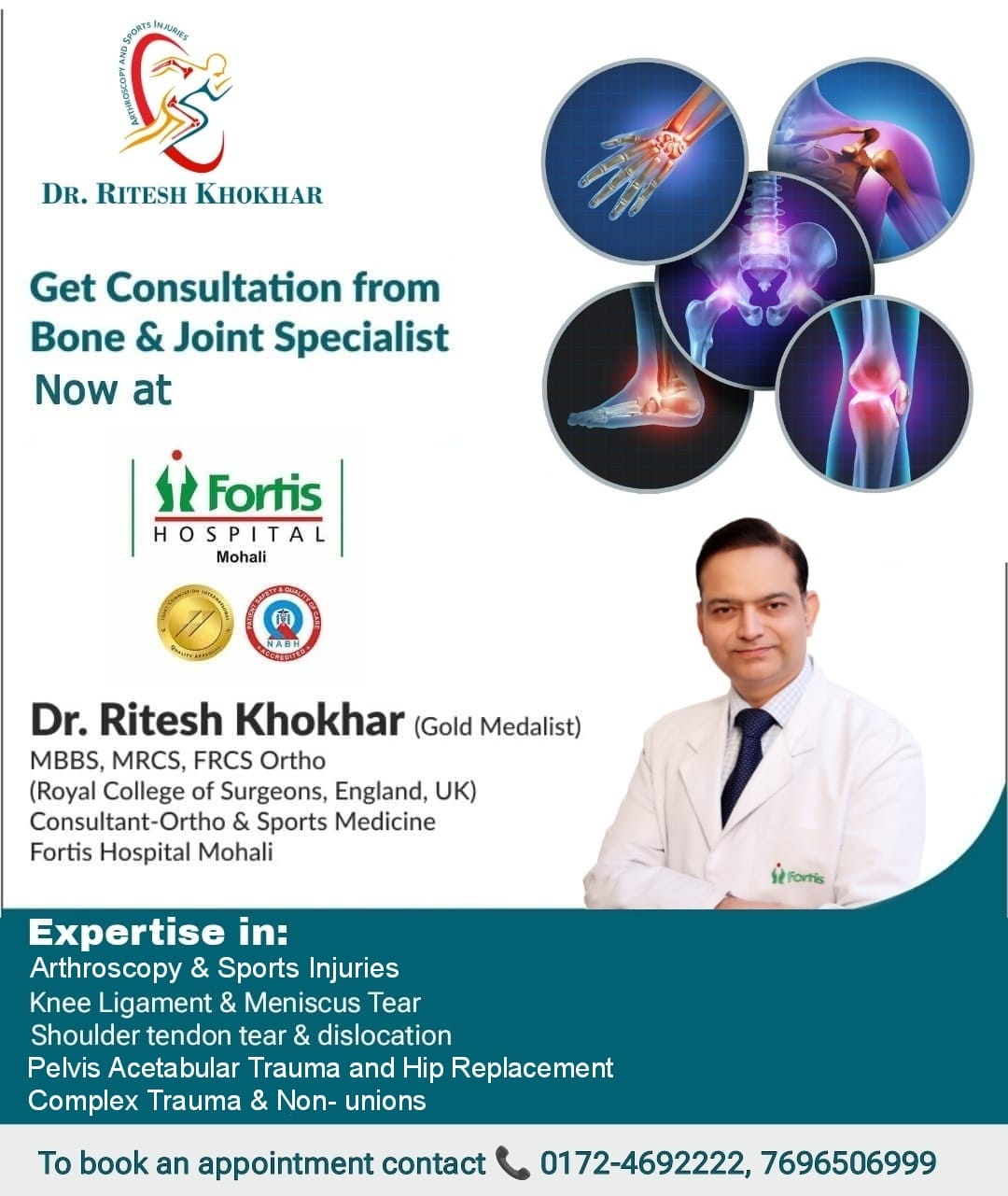 Dr Ritesh Khokhar, Orthopedic Surgeon and Sports Injuries Specialist. Opd 6, Ground Floor, Fortis Mohali 55 Google reviews Avinash Kandru2025-09-15Trustindex verifies that the original source of the review is Google. Thank you for guiding us through the surgical process with such care and professionalism. Your confidence and expertise were truly reassuring. Vineet Jain2025-08-14Trustindex verifies that the original source of the review is Google. Dr Ritesh is a great doctor. He is a very humble,coperative personI feel most comfortable with him he is very calm and caring personality I met with accident and hip bone fractured Dr sahib has advised me surgery but I was very afraid but he assured aboutt wellness now I feel more more better only because of doctor Ritesh In my life he is an angel I would recommend him Sir u always blessed with health wealth and prosperity 🙏 poonam jain2025-08-14Trustindex verifies that the original source of the review is Google. Extremely happy with Dr. Ritesh Khokhar. He is a very knowledgeable doctor and respond and listen to our queries. He performed my husband surgery and I am most grateful Thanks for being an amazing doctor and god bless you.🙏🙏 Meenu Chopra2025-07-27Trustindex verifies that the original source of the review is Google. Very humble and co operative doctor,fully satisfied with my treatment, fully recommend Rashi Sondh2025-07-04Trustindex verifies that the original source of the review is Google. Very kind and genuinely concerned professional, was very happy with my wrist treatment as it was quite painlessly done and the exercises suggested post that were extremely helpful. Rajni Sharma2025-06-26Trustindex verifies that the original source of the review is Google. Very experienced doctor . I visited him for my ailment and he checked me up me very well. Very calm and caring personality. He was carefully listening to my ailment and suggested wonderful medicines that cured my ailment. DINESH SHARMA2025-06-26Trustindex verifies that the original source of the review is Google. I went to him for my ailment and he checked me up me very well. Very calm and caring personality. He was carefully listening to my ailment and suggested wonderful medicines that actually worked like a charm. Simon2025-06-16Trustindex verifies that the original source of the review is Google. Amazing doctor and a good human being